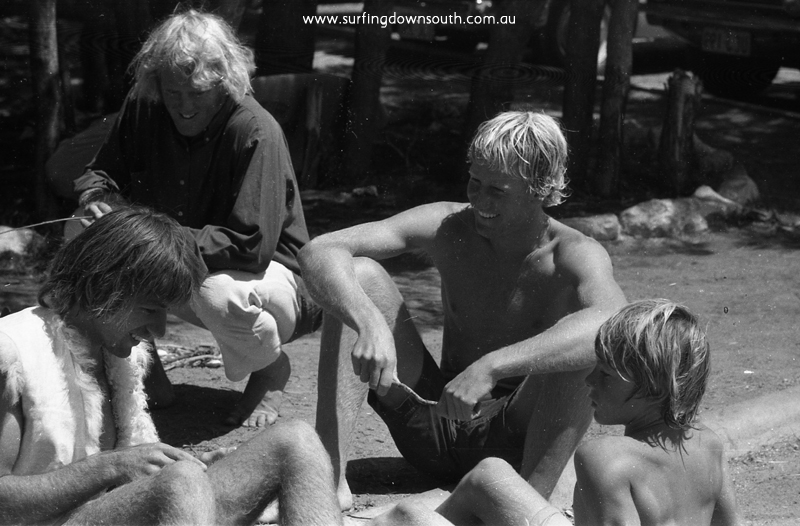 This photo shows dual WA surfing champions Peter Bothwell & Tony Hardy chatting during the 1970 State Surfing Titles at Yalls. L-R Peter ‘Spook’ Bothwell, unknown, Tony Hardy & Paul O’Callahan.. Peter won the Open Div Title in 1968 & 69 and Tony won the same Title in 1970 & 76. Paul came 3rd in WA Junior Title 1973. Photo courtesy of Ric Chan.